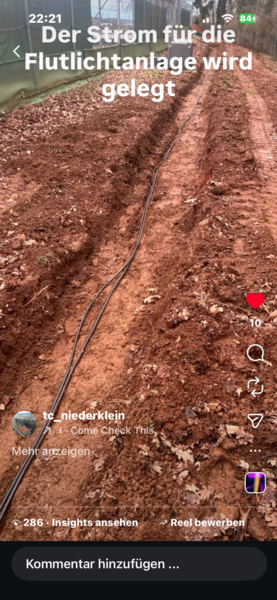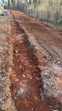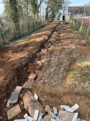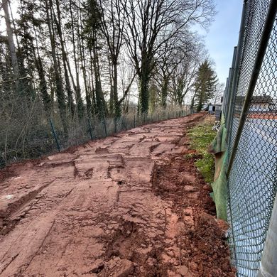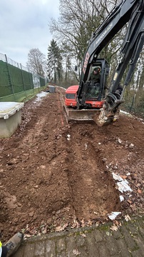 Der Graben für den Weg zum Court ist ausgebaggert. Er wird auch gleichzeitig zum Verlegen des Kabels für die Flutlicht-Anlage genutzt.