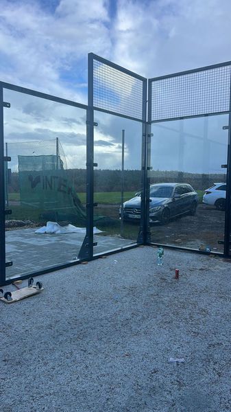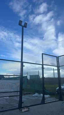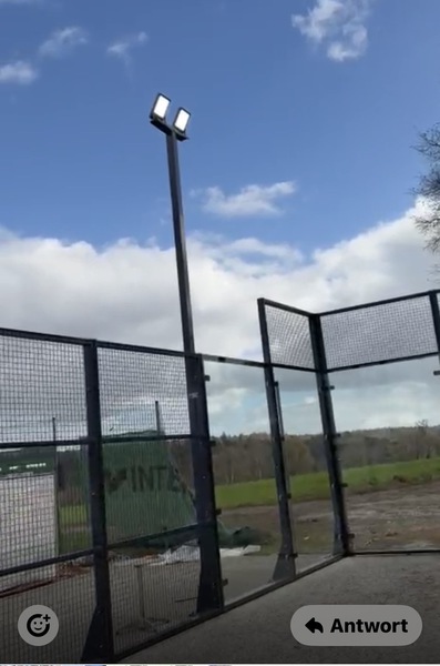 Jetzt sind auch alle Scheiben eingesetzt. Die 4 Flutlicht-Masten brennen. Eigentlich könnte gespielt werden. Aber leider ist es noch zu kalt, um den Kunstrasen verlegen zu können. Also müssen wir auf steigende Temperaturen warten, bis es endlich losgehen kann.