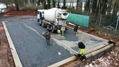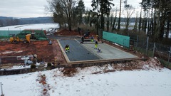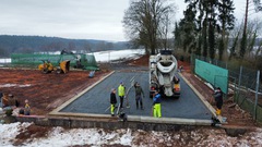 Die Bodenplatte ist heute gegossen worden und die Tiefbau-Firma wieder abgezogen. Jetzt müssen wir die Zeit bis zur Lieferung des Courts nutzen, um die Außenanlage fertigzustellen.